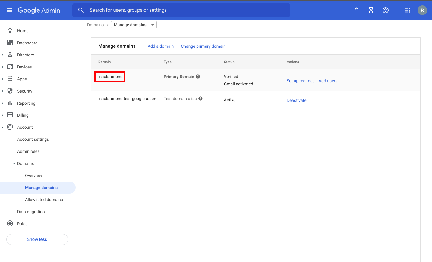 Purpose: To identify the primary domain of the Google Workspace account. -