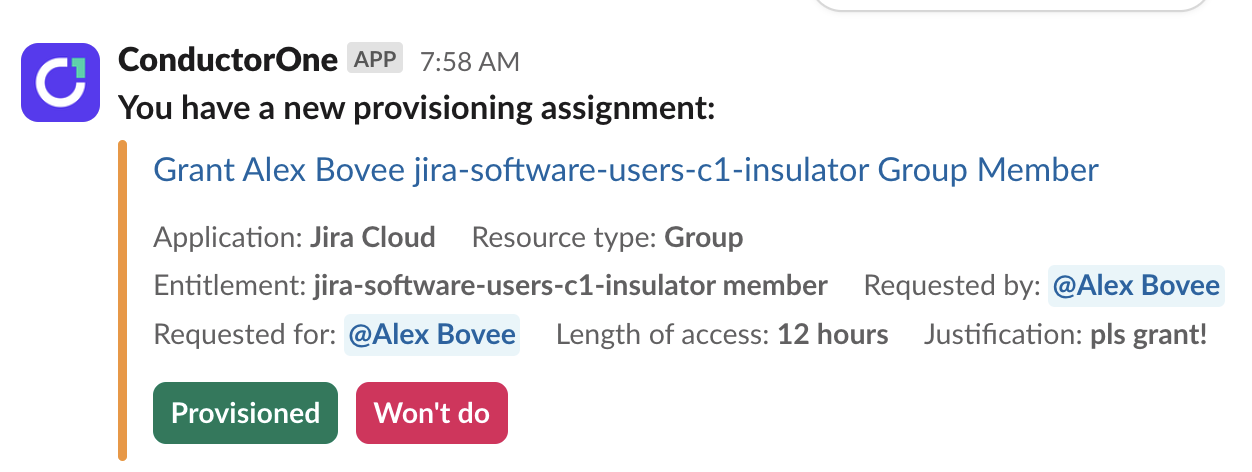 Get notified when you have a manual provisioning or deprovisioning assignment, and mark it complete without leaving Slack: